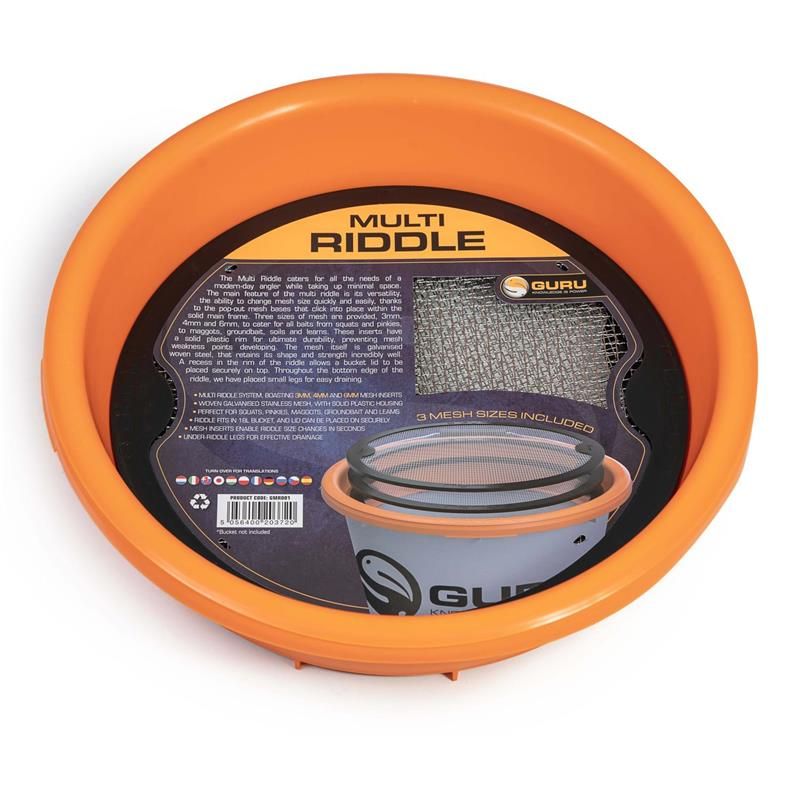 Le tamis “Multi Riddle” a été conçu pour se placer parfaitement sur nos seaux Guru et Mainline Match 17L mais il s’adapte également à d’autres seaux de cette taille.